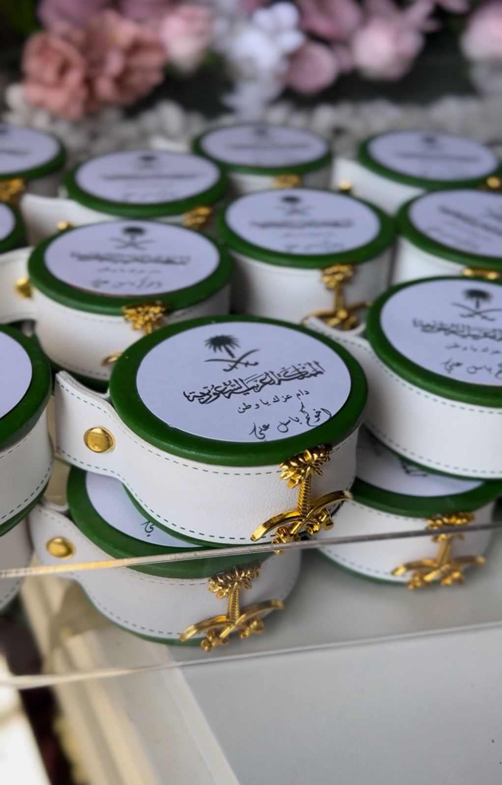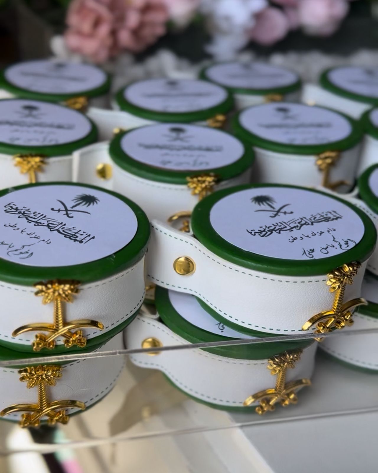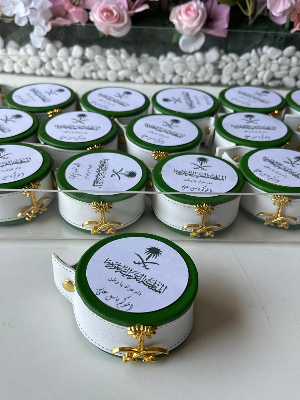 المبخرة الدائرية الفاخرة صممت خصيصًا لليوم الوطني السعودي ٩٥ لتكون رمزًا للأناقة والفخامة والهوية الوطنية. تأتي باللون الاخضر مع حزام جلد ابيض مع شعار المملكة تجسد روح الوطن، وتزينها لمسات ذهبية راقية على شكل السيفين والنخلة لتضفي عليها طابعًا مميزًا يليق بهذه المناسبة الغالية. صنعت بجودة عالية وخياطة متقنة، مما يجعلها قطعة عملية وجمالية في الوقت نفسه، حيث يمكن استخدامها لتعطير الأجواء بالعود والبخور في المنازل أو المكاتب أو كهدية راقية تعبر عن الانتماء. كما يمكن تخصيص الغطاء بعبارة وطنية أو اسم شخصي لتصبح أكثر تميزًا، مما يجعلها خيارًا مثاليًا للتوزيعات والهدايا في هذه المناسبة العزيزة